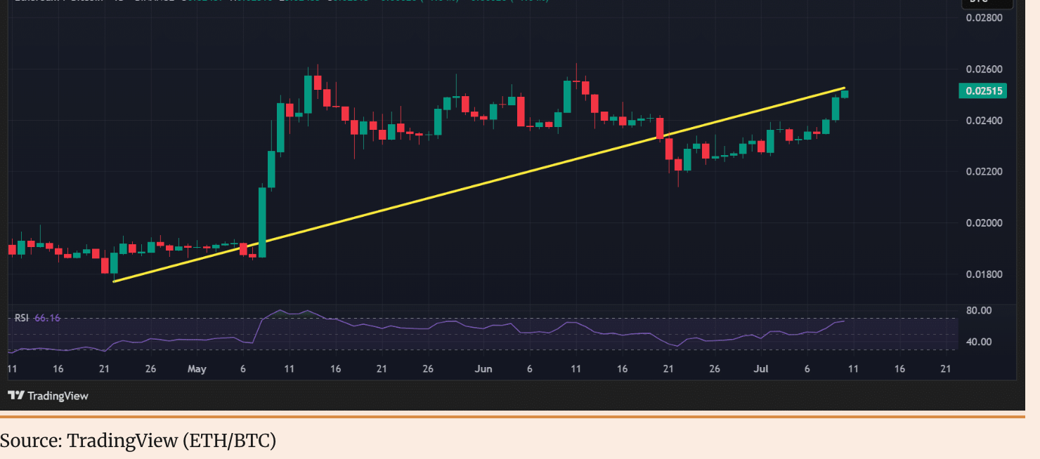 最近の強いパフォーマンスにもかかわらず、ETH/BTCレートは依然として厳しい抑制を受けており、第二四半期初めに記録された五年ぶりの安値(0.018)から50%も回復していない。