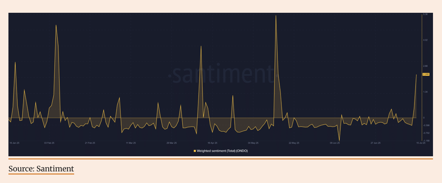 感情が高まっているが、過熱した変動に警戒 Santimentのデータによると、ONDOの加重センチメントが2.24に急増し、数ヶ月ぶりの高値を記録し、投資家の楽観的な感情が高まっていることを示しています。センチメントのピークは激しい変動を伴うことが多いですが、現在の市場は引き続き先行きに対して楽観的です。ポジティブな感情とファンダメンタルが同時に増加する限り、ブレイクアウトのサポートとなるでしょう。