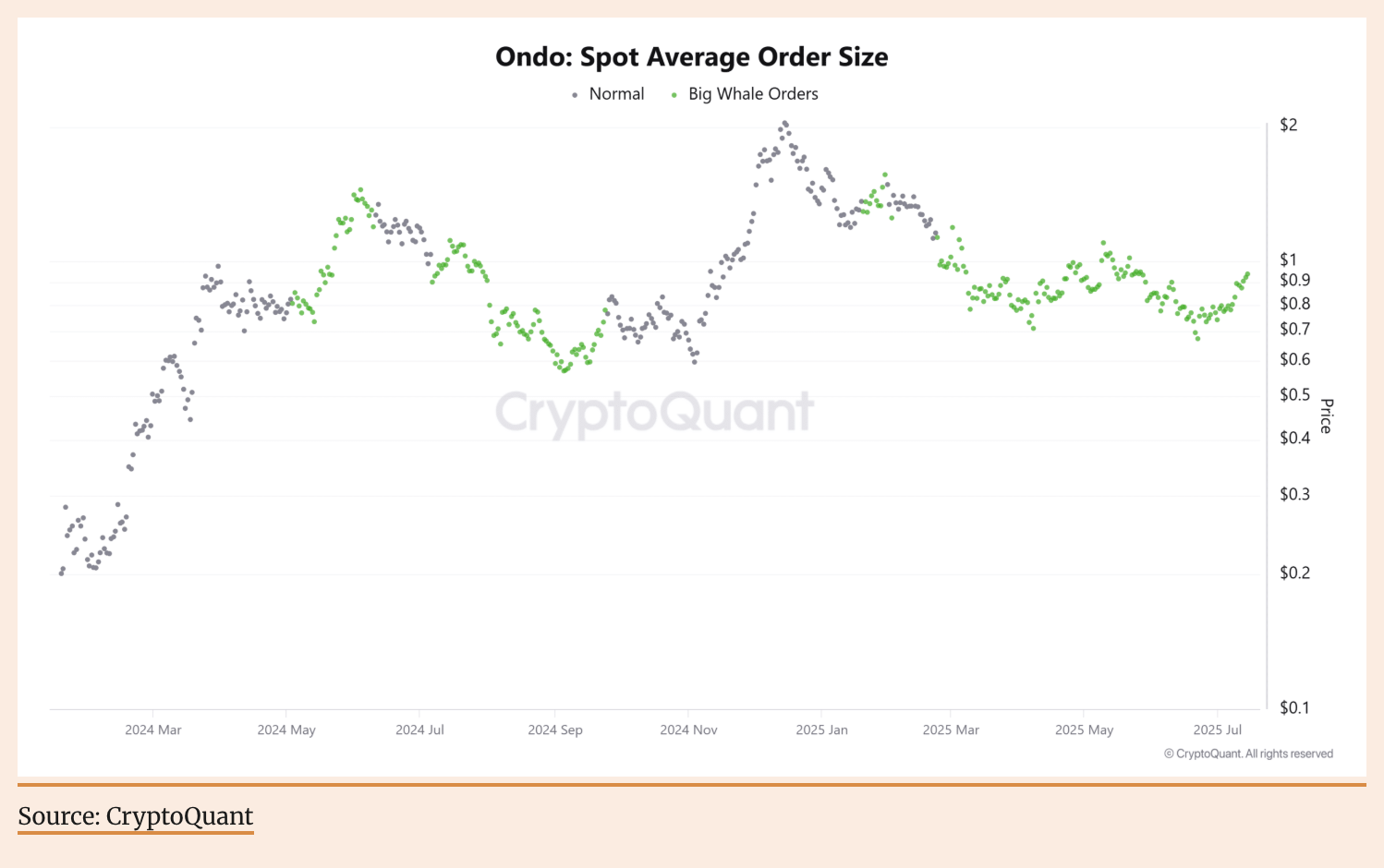 クジラの買い増しシグナルが明確で、市場の変動を吸収 現物注文データによると、取引の平均規模が大幅に上昇しており、大口の買い手が参入していることを示しています。クジラが継続的にポジションを構築することは、典型的な中長期の強気信号であり、小売のボラティリティを緩和し、価格構造を安定させるのに役立ちます。もし大口が継続的にポジションを増やすなら、ONDOの上昇に対する構造的サポートはさらに強化されるでしょう。