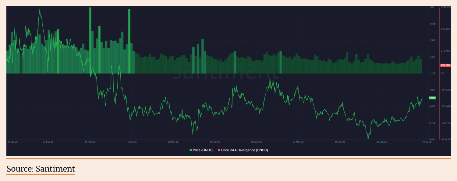 チェーン上のデータの健康、DAAの成長率は価格を上回る ONDO現在のPrice-DAA(価格-アクティブアドレス)ダイバージェンス指標は+152%で維持されており、これは日々のアクティブユーザーの増加が価格自体を上回っていることを示しています。この正のダイバージェンスは上昇過程における良好なシグナルであり、価格の増加の背後に実際のネットワーク活動が支えていることを意味し、単なる投機によるものではありません。