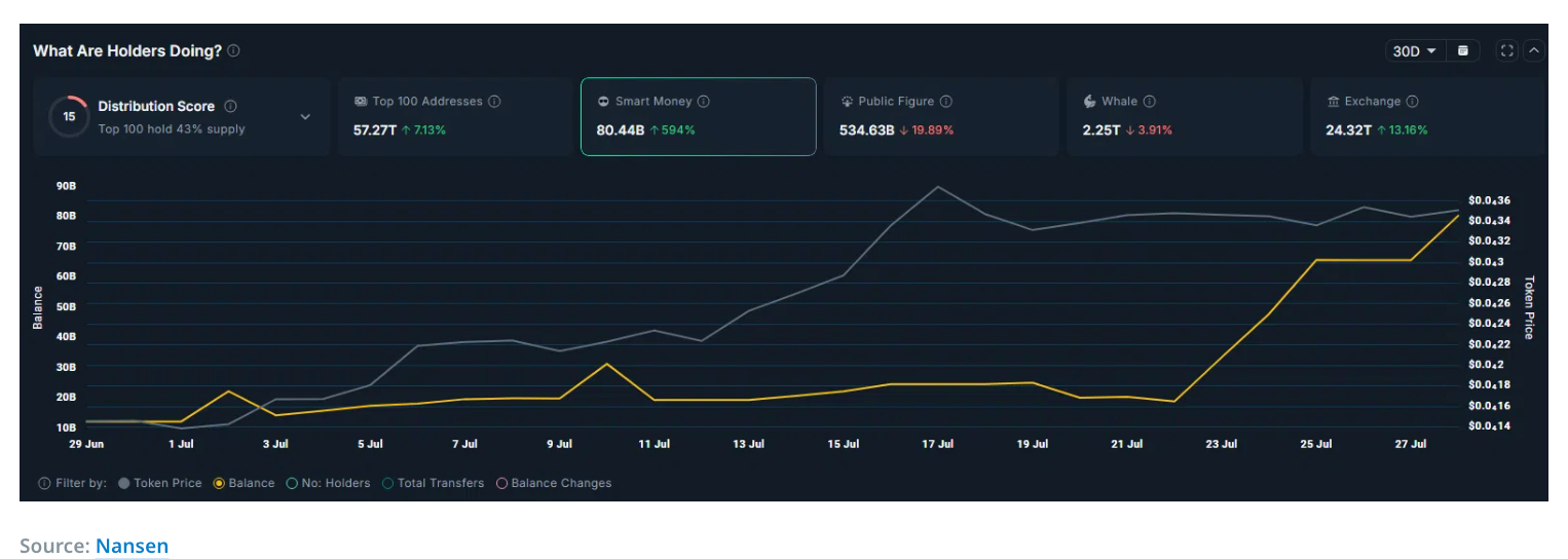 スマートマネー(Smart Money)巨量増持: オンチェーン分析プラットフォームNansenのデータによると、"スマートマネー"ウォレットは現在約804.4億枚BONKを保有しています。過去1ヶ月間、このような資本力のある投資家の蓄積トレンドが顕著に加速し、保有量は6月下旬以来594%も増加しています。スマートマネーの介入はしばしば個人投資家のFOMO感情を引き起こし、市場の追随効果を形成します。