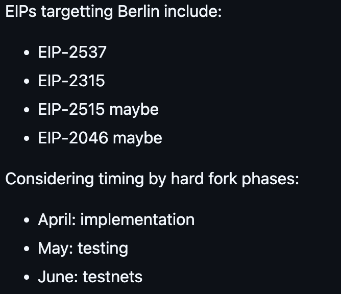 2020年4月のEthereum Core Devs Meeting #84で、会議は正式にEIP-2537をBerlinハードフォークアップグレードに組み込み、4月に実現し、5月から6月にかけてテストを行うBerlinアップグレードのタイムラインを確定しました。注目すべきは、この議論の中でEIP-2537が最優先事項として挙げられたことです。