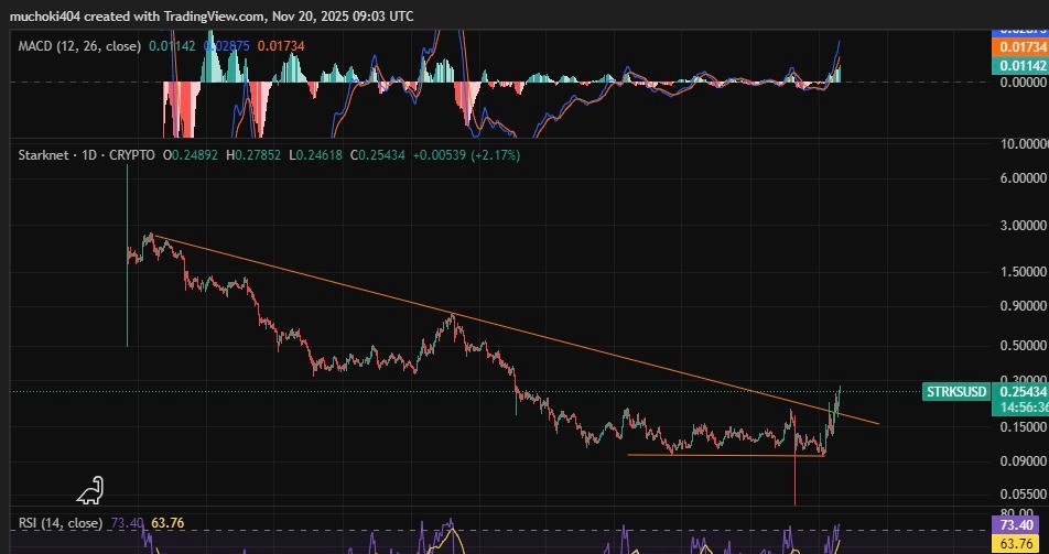 Starknet (STRK)の価格は、過去数週間で好調に推移している数少ない中型アルトコインの一つです。過去7日間で、STRKの価格は80%以上急騰し、2025年11月20日木曜日のロンドン中部セッション中に約$0.254で取引されています。