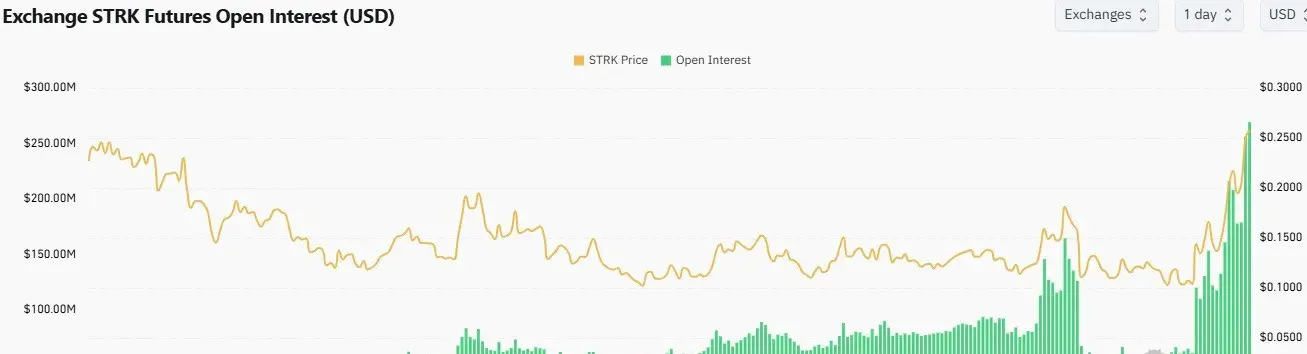 CoinGlassの市場データ分析によると、STRKのOIは今月初めの約$52 百万から、現在の時点で約$269 百万にまで急増しました。ある上位の取引所では、STRKのOIは同期間に約$11 百万から約$52 百万に急増しました。