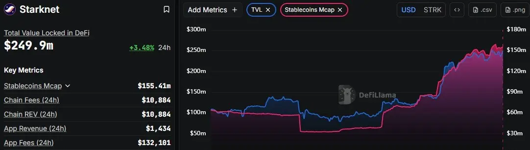 8月10日、StarknetネットワークのTVLは約$102 百万であり、現在は報道時点で約$250 百万に成長しています。同期間中にネットワークのステーブルコインの時価総額は約$38 百万から約$154 百万に増加しました。