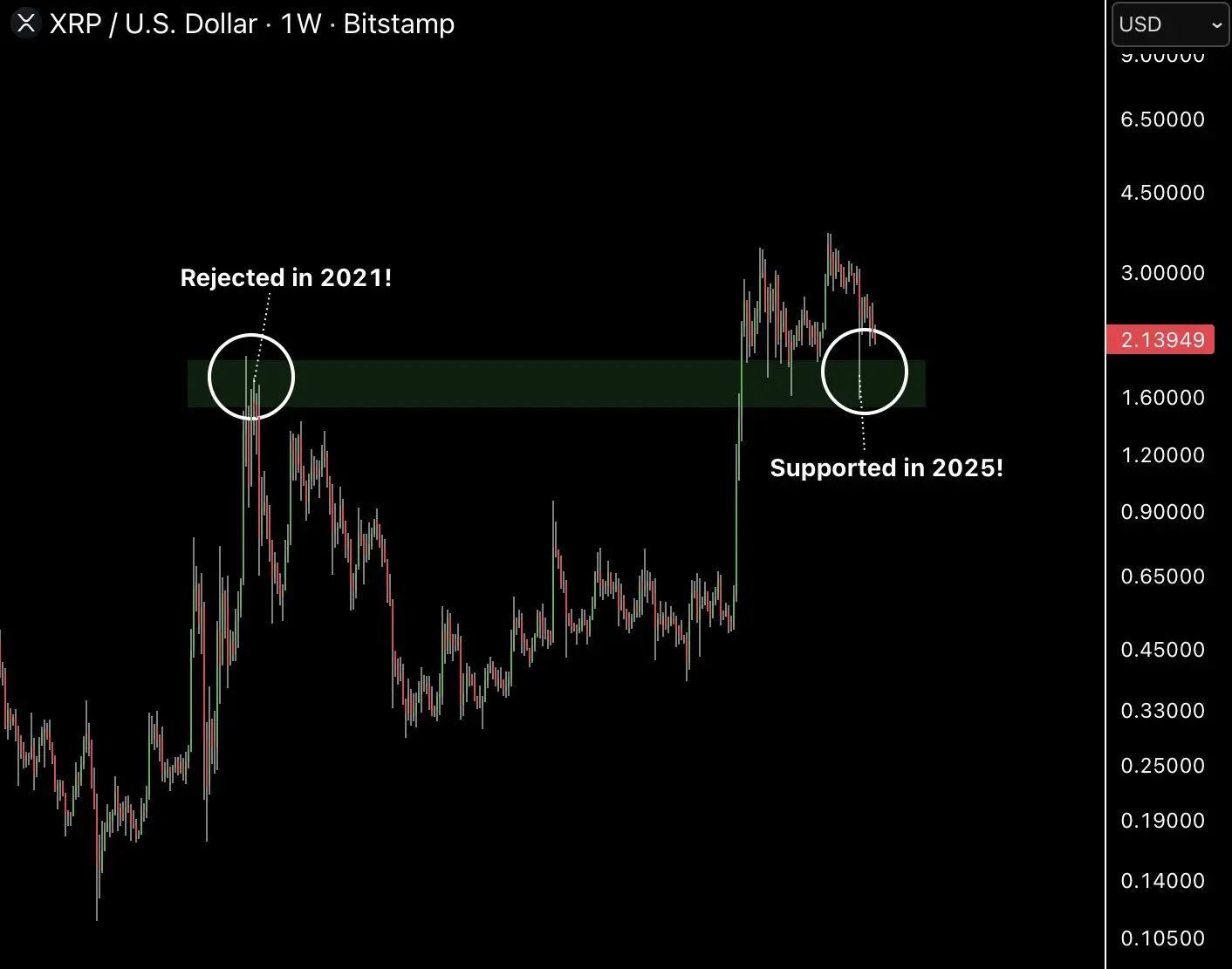テクニカル分析の観点から、XRPの価格は$2周辺の重要なサポートレベルを再テストしています。これは2021年の暗号ブルサイクル中のレジスタンスレベルでした。そのため、XRPの価格が2017年のプレイブックに従う場合、新たな史上最高値へのパラボリックなラリーが差し迫っています。