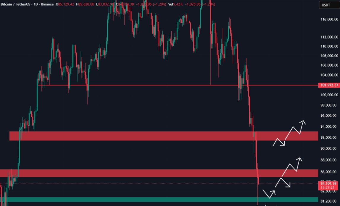 アナリストによれば、ビットコインの次の注目すべき重要なゾーンは、急激な数週間の売却の後に$85,000–$86,000エリアである。この地域は以前は需要ゾーンとして機能していたが、現在は市場が$100,000以上からの急落の後に安定を試みる中、下から再テストされている。