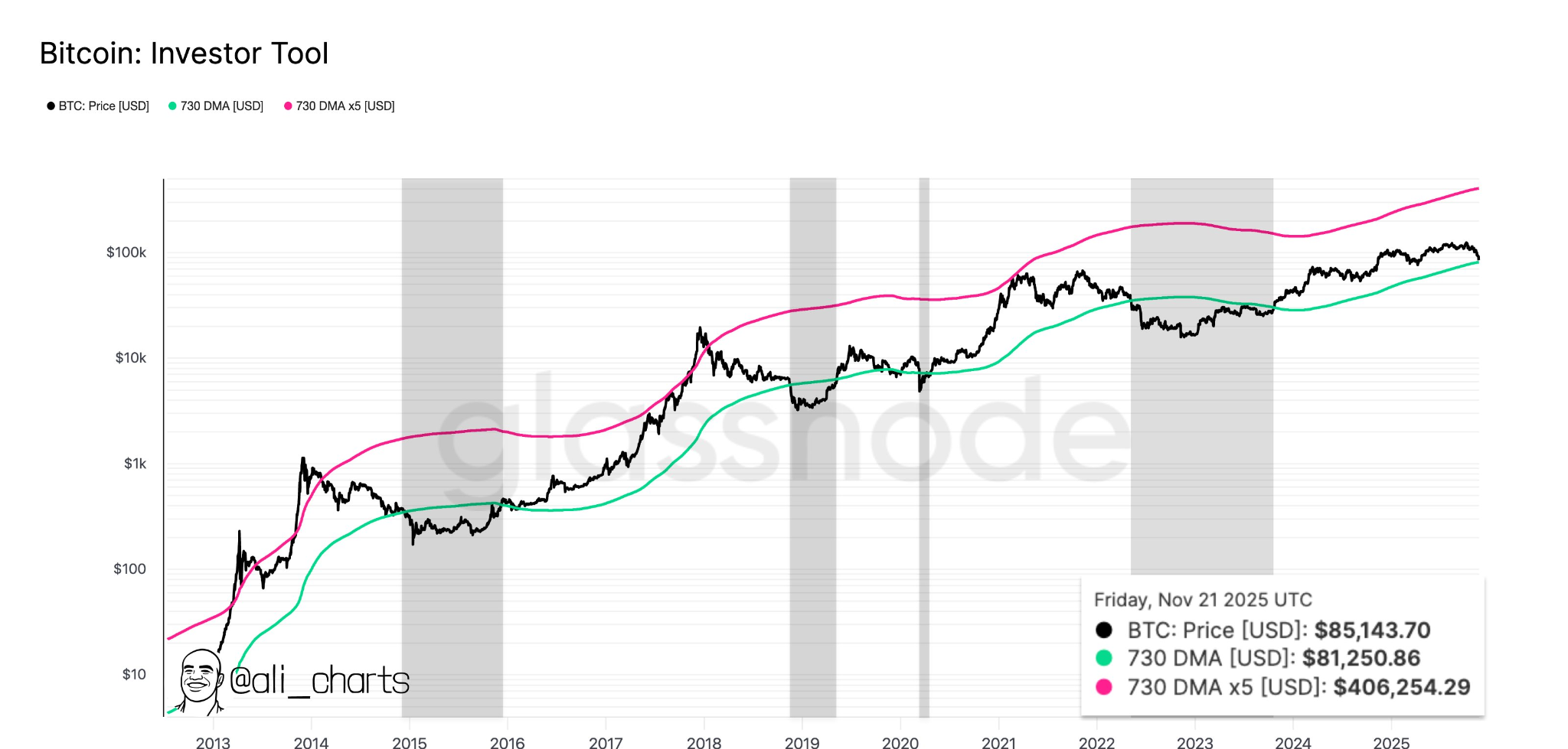 730日単純移動平均(SMA)は、過去にビットコインのベアマーケットへの移行を示してきた2年間のトレンド指標であり、現在約$81,250に位置しています。これは暗号通貨アナリストのアリ・マルティネスによって共有された洞察に基づいています。