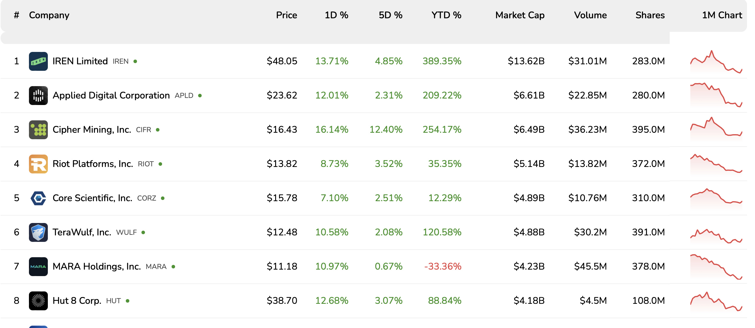 セクターの厳しい経済状況にもかかわらず、上場している上位10のマイナーはすべて過去24時間で上昇し、クリーンスパーク、サイファー・マイニング、IRENは月曜日に二桁の利益を記録しました。