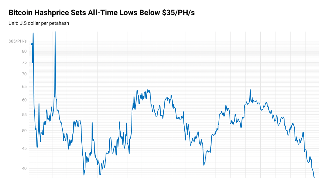 ハッシュプライスは、コンピューティングパワーあたりのマイナー収益を追跡し、$35 ハッシュを下回り、公的なマイニング会社が報告した$45/PH/sの中央値のハッシュプライスを下回っています。この低下により、いくつかのオペレーターがブレイクイーブンレベルに近づいています。