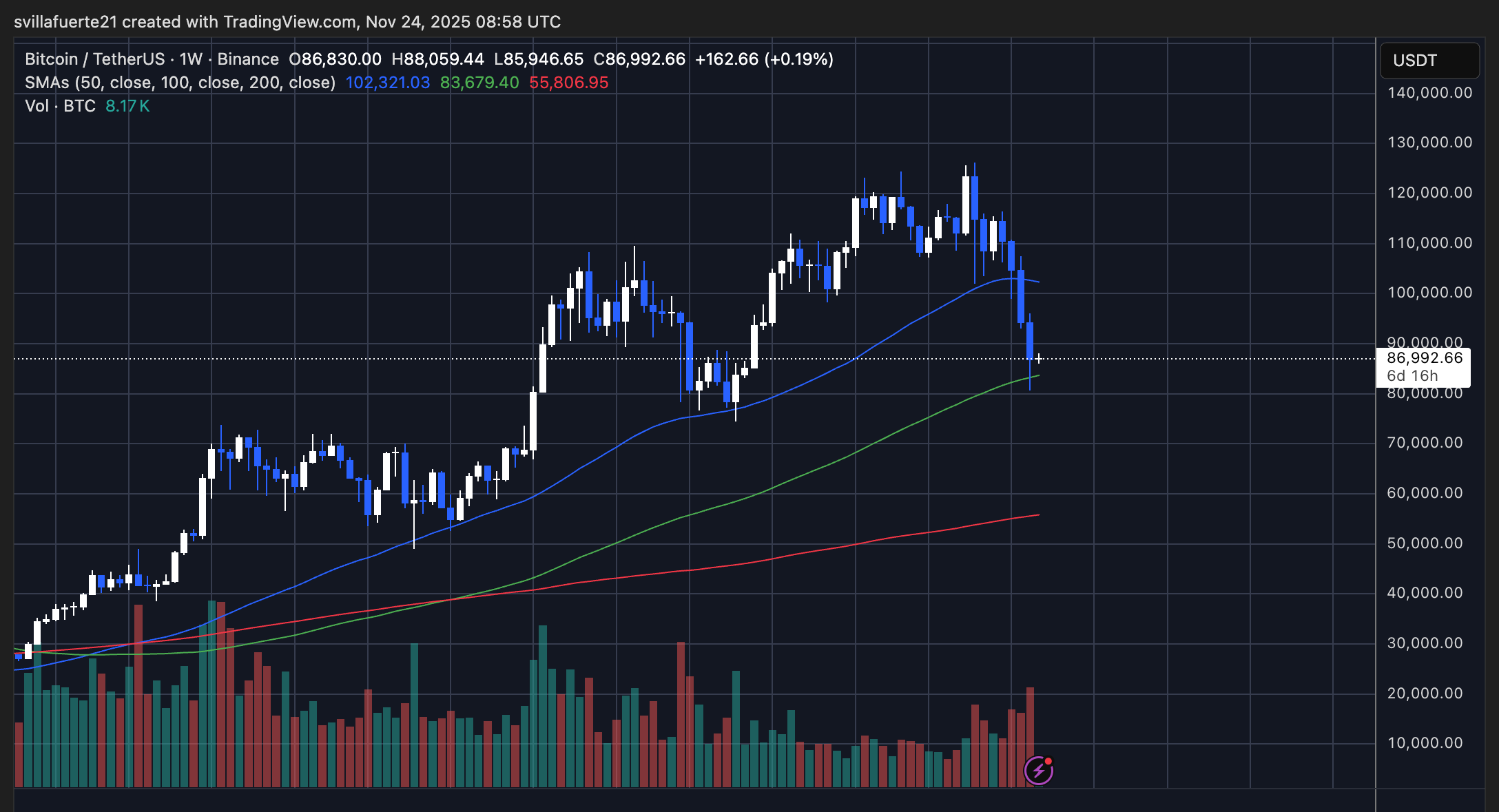 ビットコインは、価格が最低85,946ドルまで下落した激しい数週間の売り圧力の後、87,000ドルのレベルで安定を試みています。週足チャートでは、ビットコインは現在、100週移動平均(緑のライン)に達しており、これはブルマーケットの調整中に歴史的に重要なサポートレベルです。このラインは以前のサイクルでスプリングボードとして機能しましたが、現在の反発は弱く優柔不断であり、市場を支配する恐怖を反映しています。