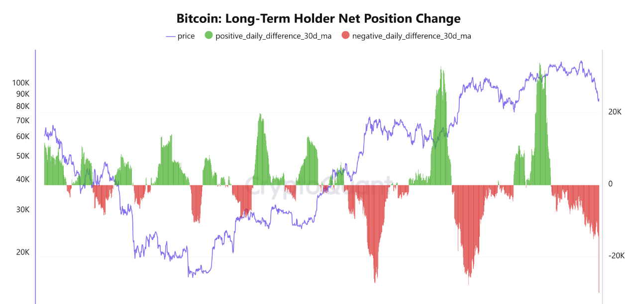 新しい報告書は、このサイクルの最も重要な進展の1つを強調しています:歴史的な63,000 BTCが長期保有者(LTHs)から短期保有者(STHs)に移動しました。この前例のない転送は、長期保有者ネットポジション変化チャートに明確に表示されており、巨大な赤いバーが示されており、長期保有者のウォレットからの大規模な流出を示す負のデイリー差異を示しています。