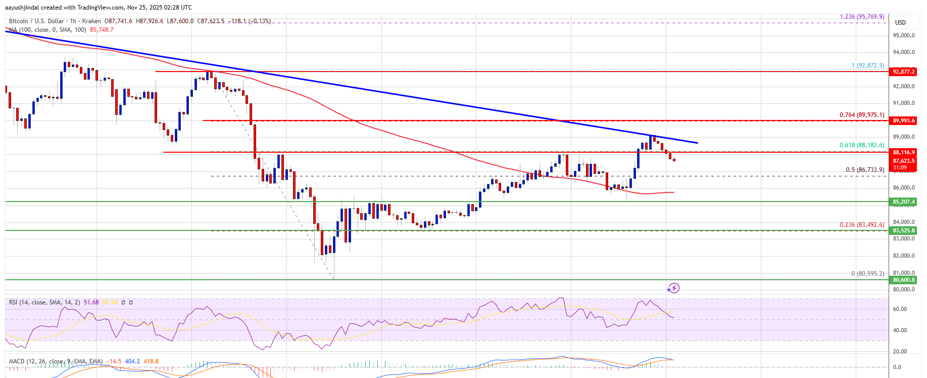 ビットコインが89,000ドルの抵抗ゾーンを上回ることに失敗した場合、別の下落を始める可能性があります。即時サポートは86,750ドルのレベル付近にあります。最初の主要サポートは86,000ドルのレベル付近です。