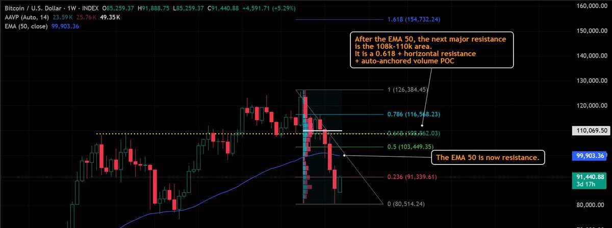 コントロールポイントは、このエリアを前のサイクルで最も取引活動が行われた地域として強化し、売り手と利益確定者の両方にとって自然な磁石となります。リトレースメントのジオメトリ、歴史的なボリューム、長期移動平均の組み合わせが、一貫したテクニカルな画像を描きます:$100K がゲートウェイですが、$108K–$110K が真の戦場です。