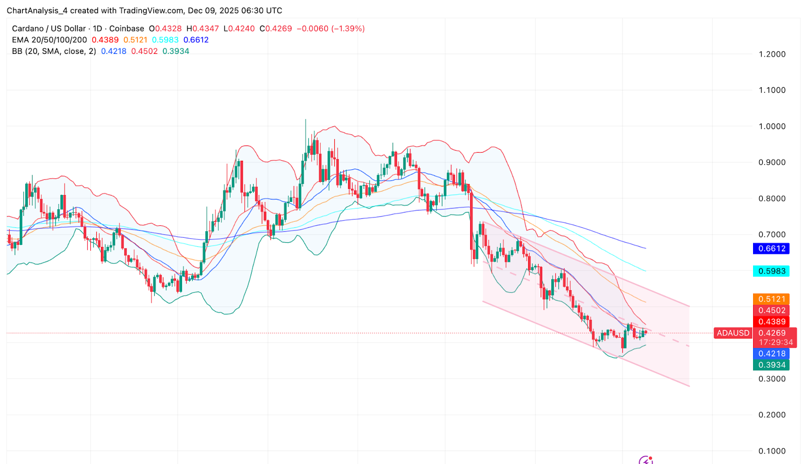 カルダノ(ADA)の価格は本日$0.426付近で取引されており、第4四半期の下落全体を導いてきた下降チャネルの上限を突破できず、わずかに下落しています。チャートでは、ADAが下落する複数のEMAと切り下がる高値抵抗の間に閉じ込められており、回復を試みるたびに同じテクニカル上限で失速しています。