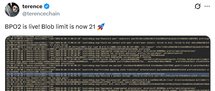 ソース:CryptoNewsNet オリジナルタイトル:Ethereum blob limit bumps up to 21, boosting network scalability オリジナルリンク: 水曜日に実施された第2回Blobパラメータ専用ハードフォークにより、Ethereumのスケーラビリティが向上し、blobの上限が15から21に引き上げられました。これは、2026年にEthereumエコシステムのスケーリングを目的とした多くの改善の最初のものです。