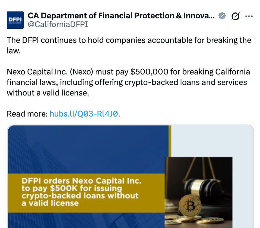 カリフォルニア金融保護革新局(DFPI)は、Nexoが有効なライセンスなしで少なくとも5,456件の消費者および商業融資を行ったと述べました。