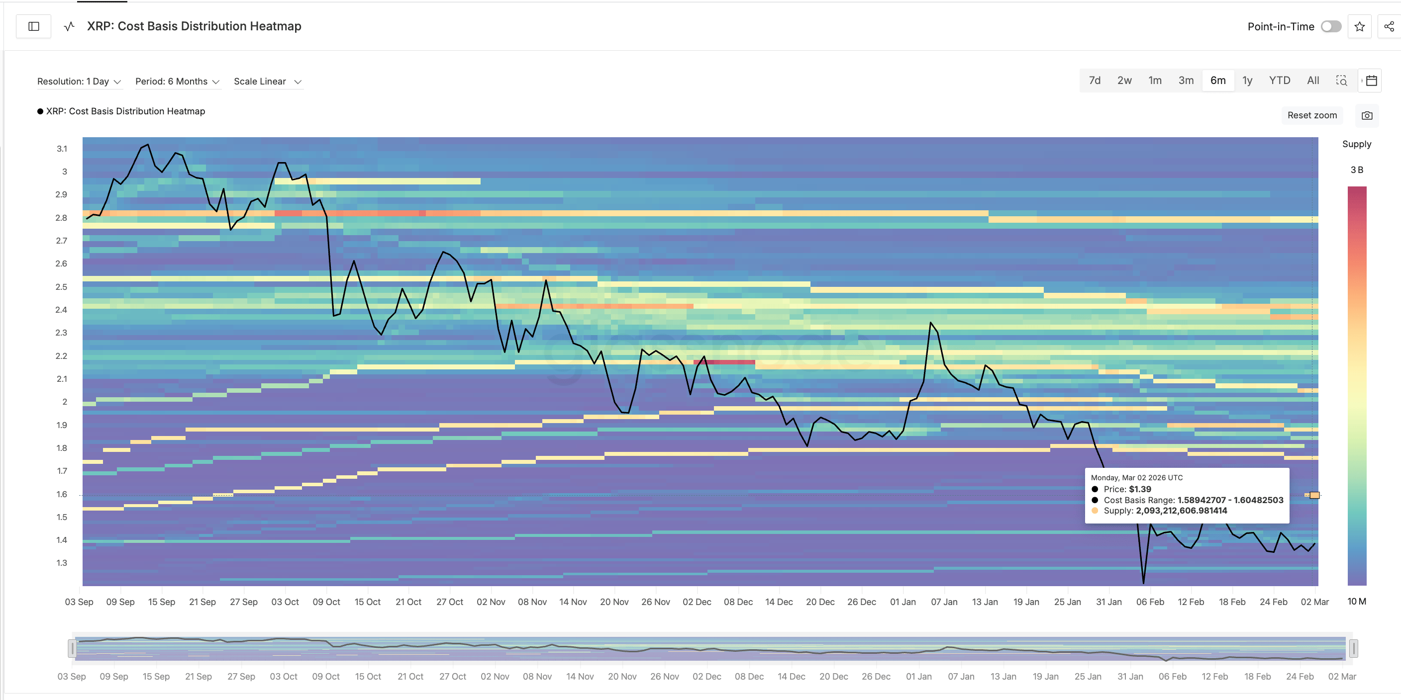 XRPは2月下旬に一時1.27ドルまで下落し、直近の安値をつけた。2月28日に底打ちした後、急速に反発し、3月初旬には1.43ドルに達した。注目すべきは、2月15日に一時1.67ドルまで高騰したものの、すぐに強い売り圧に押されて1.36ドル付近に戻されたことだ。この高値からの急落は、上方の1.60ドル付近に巨大な供給圧力が存在することを直接示している。オンチェーンデータによると、この区間には約20億XRPの買いコストが蓄積されている。