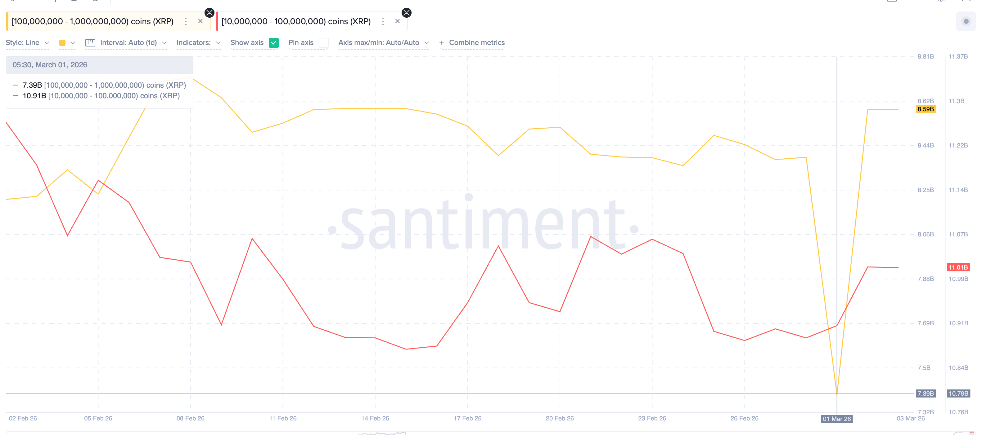 2026年3月の暗号市場は、XRPを巡る微妙な駆け引きの真っ只中にある。価格は2月の底打ち後、1.36ドル付近で安定しているが、そのすぐ上の約1.60ドルには、200,000,0000枚を超えるXRPからなる巨大な供給集団(売り壁)がまるで鉄の幕のように市場の上昇可能性を抑え込んでいる。この壁の背後には、ETF資金の継続的な流入、巨額の資金を持つ大口の静かな買い増し、そして未だに消えない隠れた弱気シグナルが潜んでいる。本稿はGateの市場データとオンチェーン情報をもとに、20億の売り壁という核心的な矛盾を軸に、事象の流れを整理し、市場の意見の相違を解き明かし、今後のXRPの可能性のシナリオを展望する。## 20億枚のXRP売り壁が圧迫、多空の攻防戦が白熱Gateの市場データによると、2026年3月3日時点でXRPの価格は1.35ドル、24時間取引高は8,260万ドル、市場総額は827億ドル、シェアは5.59%。過去24時間で0.44%の小幅上昇を見せる一方、過去30日間では17.54%の下落を記録している。テクニカル的には、2月28日に1.27ドル付近で支えられた後、約12%反発して1.43ドルに達したが、その後再び1.36ドル付近に押し戻され、価格は徐々に狭まるレンジ内に圧縮されている。しかし、その静かな動きの裏側では、主要な矛盾が渦巻いている。市場は上方の重い売り圧を消化しつつ、下方の資金とポジション構造の変化に対応しなければならない。## 2月の底打ちから3月の集結へ、重要な節目XRPは2月下旬に一時1.27ドルまで下落し、直近の安値をつけた。2月28日に底打ちした後、急速に反発し、3月初旬には1.43ドルに達した。注目すべきは、2月15日に一時1.67ドルまで高騰したものの、すぐに強い売り圧に押されて1.36ドル付近に戻されたことだ。この高値からの急落は、上方の1.60ドル付近に巨大な供給圧力が存在することを直接示している。オンチェーンデータによると、この区間には約20億XRPの買いコストが蓄積されている。3月に入り、価格は前の高値を突破できていないが、市場の資金構造は静かに変化している。ETF資金は連続2日間純流入を続け、巨額の大口アドレスも積極的に買い増しを行い、長期保有者の指標も縮小傾向を示している。20億の売り壁の下で、多空の勢力が加速して集結し、攻防戦の幕が上がろうとしている。## 20億の供給壁と13億の巨鯨の買い増し### 上方の鉄幕:20億のコスト集団オンチェーンのコスト分布データによると、1.58ドルから1.60ドルの範囲内で、約20億枚のXRPが取引者により買い集められている。このエリアは典型的な「供給壁」を形成しており、その理由は、価格がこの位置に戻ると、多くの買い持ち者が損益分岐点付近にいるためだ。市場のセンチメントが弱いと、これらのポジションの解消売りが誘発され、強力なテクニカルな抵抗となる。2月15日に一時1.67ドルまで高騰した後、急落したのもこの供給圧力の直接的な反映だ。*コスト基準:Glassnode*### 下方の支え:機関と大口の買い増し上方の重い売り圧に対して、下方では資金の積極的な買い支えが進行している。- ETF資金の継続流入:機関投資家の関与が高まっている。3月のXRP現物ETFは好調で、数日前には690万ドルの純流入を記録し、1月の総流入額(1,559万ドル)の約45%に相当する。2月の総流入額は5809万ドルに達しており、機関資金は価格の乱高下に関わらず市場から離れていないことを示す。*XRP ETF:SoSo Value*- 巨鯨の買い増し加速:オンチェーンデータはより直接的な市場行動を示す。3月1日以降、2つの主要な鯨グループが大規模に買い増しを開始した。100M〜1B XRPを保有するアドレス群は、総保有量が73.9億枚から85.9億枚に増加。10M〜100M XRPのアドレスも、109.1億枚から110.1億枚へ増加した。わずか数日で、これらの大口鯨だけで13億XRPの買い増しが行われた。これは、20億の売り壁の下で「鯨が底を固め、突破を待つ」動きと一致している。*XRP鯨:Santiment*### 供給構造:集中度の高い二面性さらに深いオンチェーンの構造を見ると、XRPの供給分布は非常に集中している。10万枚超のアドレスが全供給の83.7%をコントロールしている。この極端な集中度は、市場における「実質流通量」が名目の供給量よりもはるかに少ないことを意味し、鯨グループの集団行動——買い増しや配布——は価格に大きな影響を与える。現在の買い増しは売り圧を吸収し、価格の緩衝材となっているが、逆にトレンドが変われば、これらの資産は大きな下落エネルギーに変わる可能性もある。## 楽観的な買い増しと隠れた弱気シグナルの攻防市場の解釈は二極化しており、その分岐点はオンチェーンのシグナルの真意の評価にある。- 楽観派(「仕込みの段階」):この見方は、機関資金と鯨の同期した動きに注目する。ETFの流入は規制当局の承認を示し、鯨の抵抗線下での買い増しは「賢い資金」の未来の突破戦略とみなされる。また、長期保有者の活動を示す「Liveliness」指標は2月中旬以降、六ヶ月ぶりの低水準に近づいており、長期保有者が供給を絞り込み、反発を狙っていると解釈される。総合的に見て、