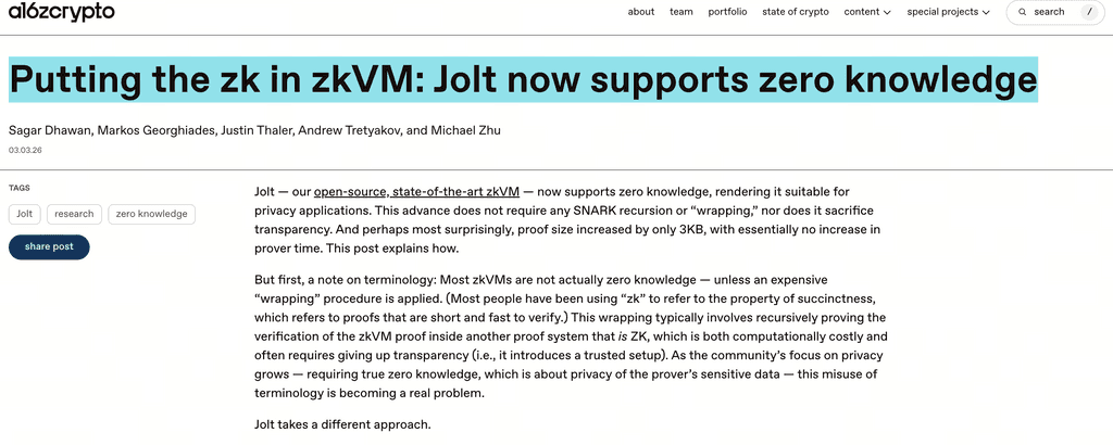 a16z Crypto、Jolt zkVMのアップグレード: 「ZK」タグの乱用とゼロ知識プライバシーの欠如問題を直接指摘