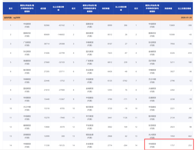 Based on previous data from Shanghai silver futures, on January 20, Zhongcai Futures (agency) only appeared in the position ranking for contract AG2606, holding 1,757 short lots at that time.