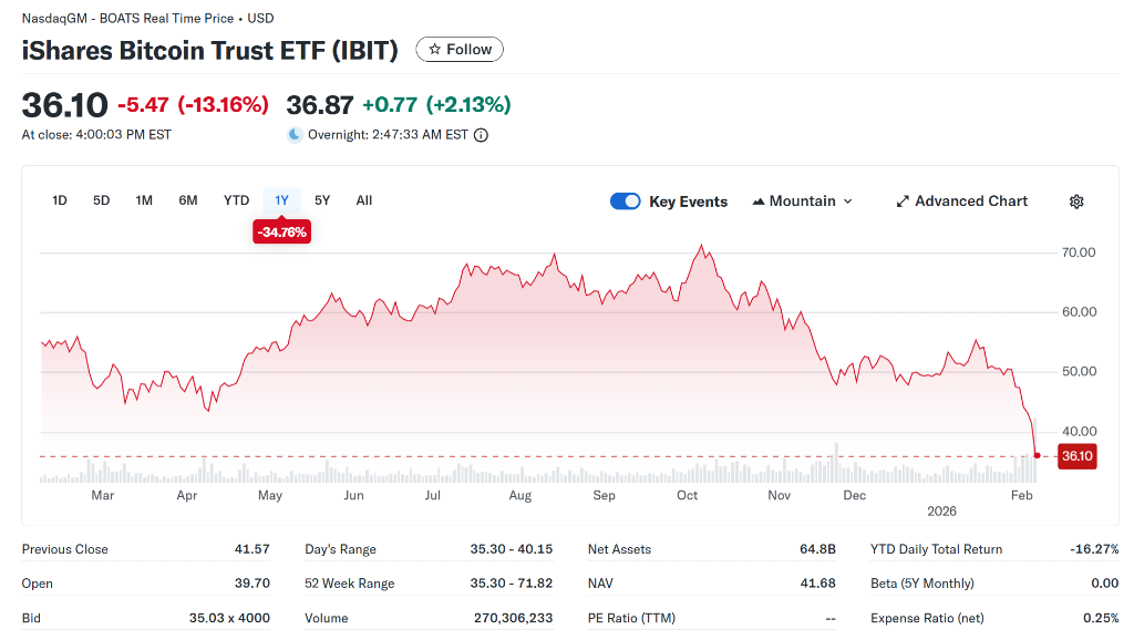 In terms of price, IBIT briefly fell below $35, reaching the lowest level since October 11, 2024. The fund’s price peaked at $71.82 in early October last year and has been declining since. As the world’s largest publicly listed Bitcoin fund, IBIT holds physical Bitcoin, aiming to mirror the spot price of Bitcoin. On Thursday, Bitcoin briefly dropped close to $60,000.