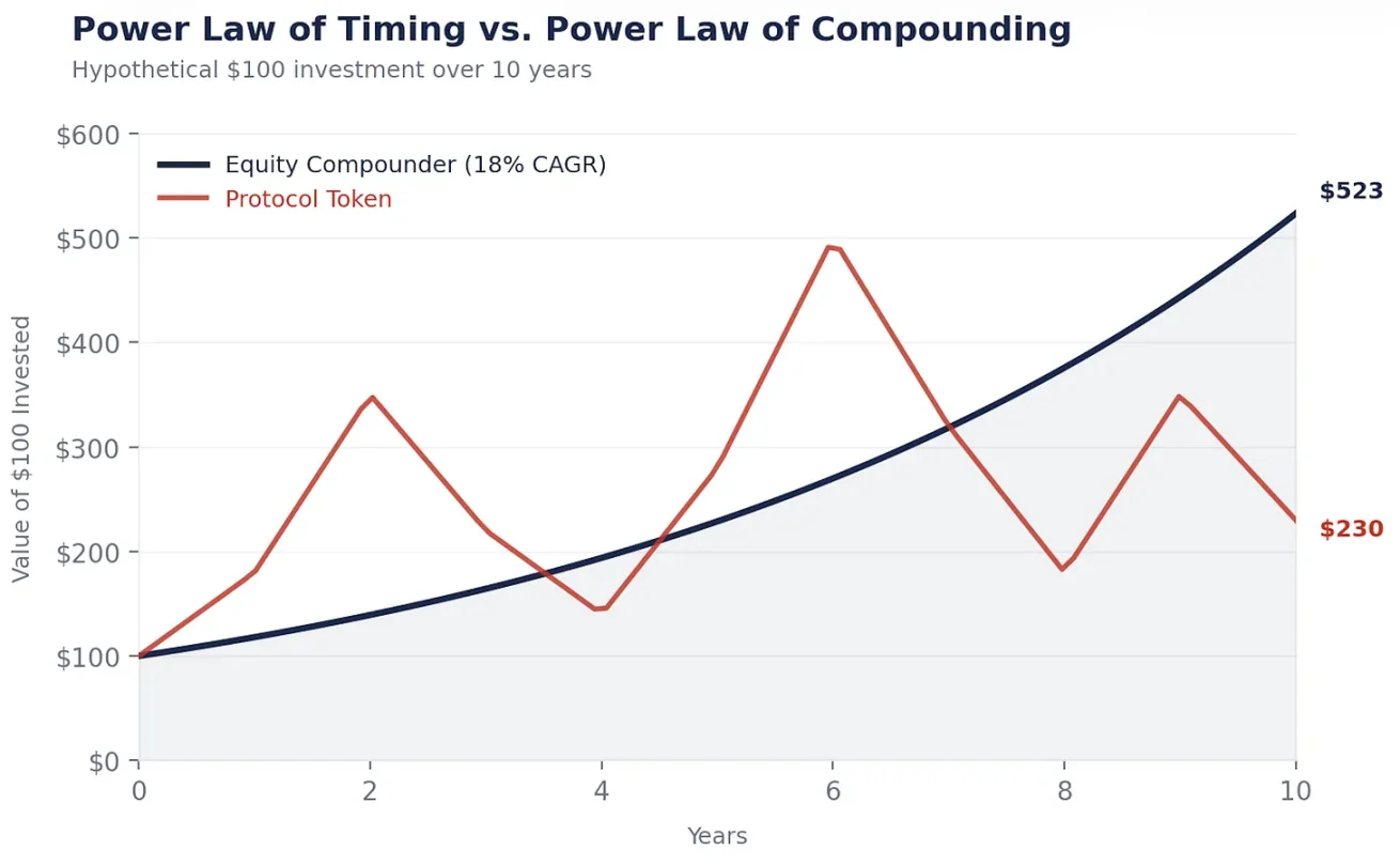 The issue is not the technology itself but the economic model of tokens. Today’s blockchain networks merely transfer value, not accumulate and reinvest to achieve compound growth. But this will change: regulation will improve, governance will mature, some protocol will find a way to retain and reinvest value like a successful enterprise. When that day comes, tokens will essentially become stocks in all but name, and the engine of compounding will be officially activated.