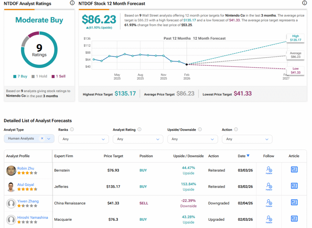 Turning to Wall Street, the analysts’ consensus rating for Nintendo is Moderate Buy, based on seven Buy, one Hold, and a single Sell rating over the past three months. With that comes an average NTDOF stock price target of $86.23, representing a potential 61.93% upside for the shares.