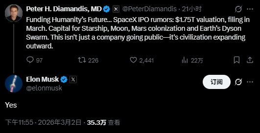 Earlier today, well-known American entrepreneur Peter Diamandis wrote on social media that rumors suggest SpaceX will file for an IPO in March with a valuation of $1.75 trillion. The funds are expected to be used for Starship, lunar and Mars missions, and the Earth Dyson Sphere project.