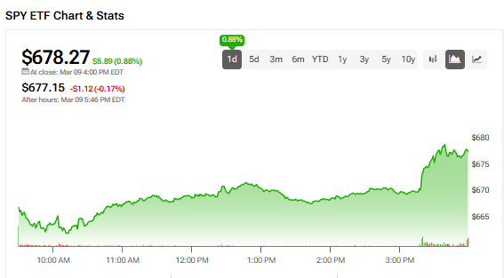 The SPDR S&P 500 ETF Trust SPY +0.88% ▲ rose 0.88% today, March 9, with support from a pullback in oil prices and easing geopolitical tensions.