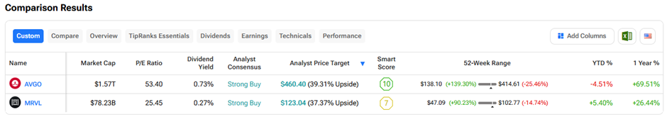 According to TipRanks’ Stock Comparison Tool, analysts have assigned a “Strong Buy” consensus rating on both AVGO and MRVL stocks, with Broadcom stock offering a higher upside potential over the next twelve months. AVGO stock also carries a higher dividend yield compared to MRVL.