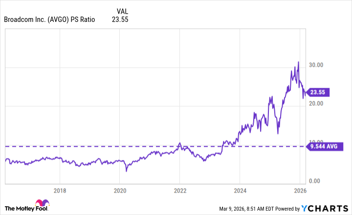 Broadcom stock is trading at a price-to-sales (P/S) ratio of 23.5, which is more than double its 10-year average of 9.5. That doesn’t leave much room for upside in the short term, but based on the company’s rapidly accelerating revenue growth, the stock might be attractive for investors who are willing to hold onto it for a period of three to five years.