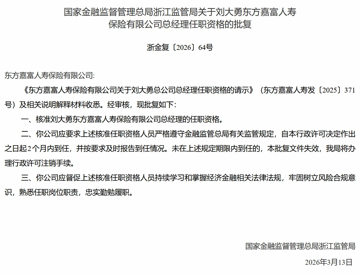 On March 16, the Zhejiang Regulatory Bureau of the National Financial Supervision and Administration released an approval, granting Liu Dayong the qualifications for the position of General Manager of Oriental Jiafu Life Insurance Co., Ltd.