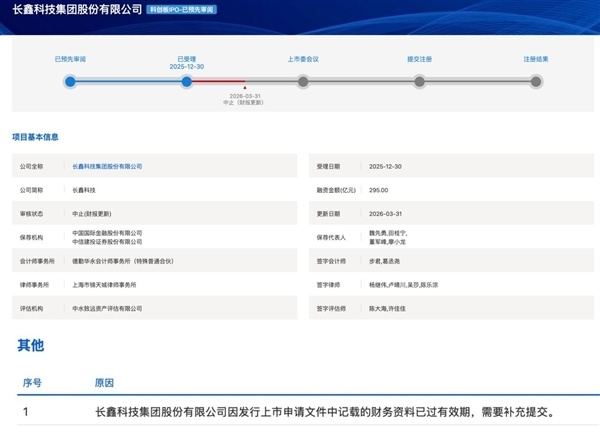 According to the latest information on the Shanghai Stock Exchange website dated March 31, Changxin Technology, the domestic DRAM giant, has had its STAR Market IPO review status changed to “suspended.”