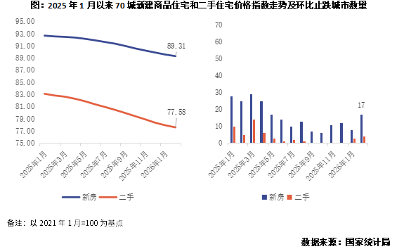 In February 2026, overall, among 70 large and medium-sized cities, the month-on-month decline in the sales prices of commodity residential homes continued to narrow, and prices fell year-on-year as well. The number of cities where new-home prices stopped falling month-on-month increased to 17, the highest since the second half of 2025.