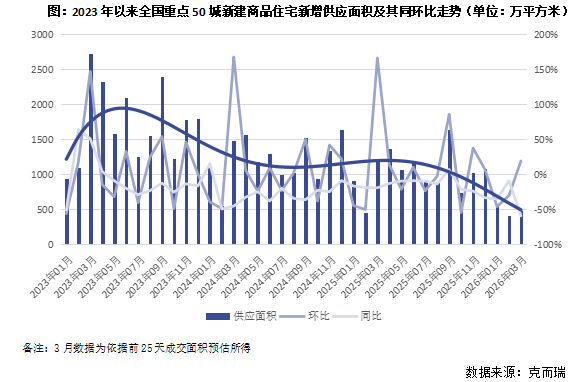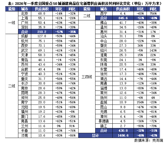 In the first quarter of 2026, the total newly added supply area of newly built commodity residential housing in China’s key 50 cities was 14.866 million square meters. Both month-on-month and year-on-year it fell sharply by 48% and 42%, respectively. The supply side contracted significantly.