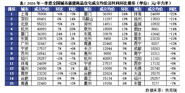 In the first quarter of 2026, based on the ranking of transaction average prices, Shanghai led with 75,908 yuan per square meter, but both month-on-month and year-on-year it declined by 6% and 3%, respectively, indicating a slight pullback in price. Shenzhen’s transaction average price was 68,401 yuan per square meter; it was flat month-on-month and up 14% year-on-year, reflecting stronger price resilience. Beijing’s transaction average price was 55,223 yuan per square meter; it decreased slightly by 5% month-on-month and 1% year-on-year, showing a relatively stable price trend. Cities such as Hangzhou, Xiamen, and Dongguan also had transaction average prices above 30,000 yuan per square meter. Among them, Xiamen’s transaction average price rose sharply by 24% month-on-month and by 11% year-on-year. This is more a structural increase in transaction average prices driven by a higher share of premium housing transactions under relatively low total volume. Hangzhou shows a similar pattern. Looking at the ranking by month-on-month changes in transaction average prices, early signs of price repair emerged for many third- and fourth-tier cities and for deeply adjusted second-tier cities such as Zhengzhou and Changsha. Looking at rankings by year-on-year changes, second-tier cities such as Nanjing, Chengdu, Xi’an, Nanning, Shenyang, and Dalian saw larger declines. Compared with cities like Yangzhou and Yancheng and Yantai and Lishui in the third- and fourth-tier, where pressures have remained high and price adjustments persist, their year-on-year declines were leading, indicating that market adjustment pressure remains large.