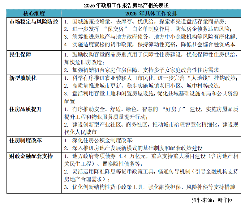 In 2026, the core of this dimension is two-way demand-and-supply regulation plus risk prevention and joint response across the entire chain. It clearly calls for “implementing city-specific policies to control incremental supply, reduce inventories, and optimize supply,” and will make revitalizing existing residential properties through multiple channels a core lever for market stability. At the same time, the “delivery-guarantee-for-completed-homes” (bao jiao fang) whitelist system will be normalized. For the first time, it will also propose coordinating and advancing the joint resolution of risks in real estate and local government debt, as well as risks in local small and medium financial institutions. Monetary policy will also specifically create a dedicated financial environment to support reasonable real estate financing.