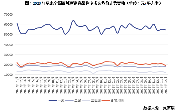 From January 2023 to February 2026, the transaction average price of newly built commodity residential homes across China’s “hundred cities” fluctuated within the 19,000–22,000 yuan per square meter range. Overall, the trend remained relatively stable, showing price resilience. The market overall followed a path of “spike up then fall back, then oscillate at low levels, and gradually stabilize and rise again.”