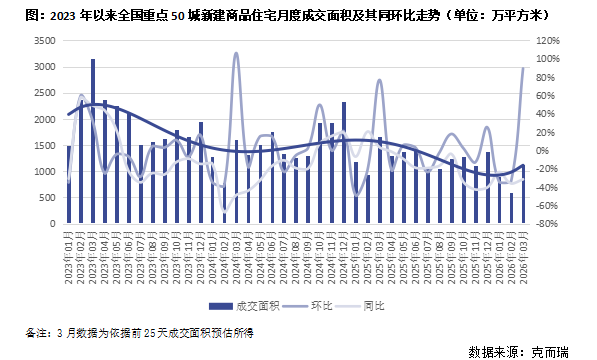 In the first quarter of 2026, the transaction side showed clear signs of improvement. From January 2023 to October 2025, new-home transaction area in key 50 cities fluctuated within the range of 10 to 15 million square meters, with an overall downward trend. In January 2026, transaction area dropped to a stage low of about 10 million square meters, and both month-on-month and year-on-year declined sharply. In March, transaction area continued to rise to 11 million square meters; month-on-month growth surged by 89%, and the year-on-year decline narrowed to 32%.