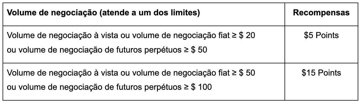 Os usuários que se registraram, mas sem nenhum depósito ou negociação, das 05h00 de 17 de março às 01h59 de 17 de abril (UTC) com verificação KYC2, podem ganhar mais recompensas negociando mais durante o evento.