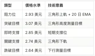 Manter-se na consolidação dentro do triângulo de 2,74-2,93 dólares, aguardando um catalisador mais claro. O tempo pode durar de 1 a 2 semanas.