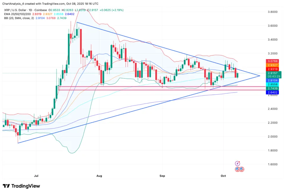 No dia 9 de outubro, o preço de negociação do XRP está próximo de 2,85 dólares, consolidando-se dentro de uma formação de triângulo simétrico. A análise técnica mostra que o XRP está à beira de um rompimento crucial.