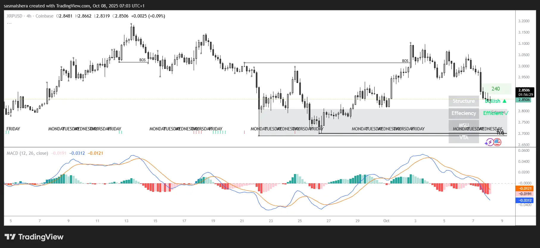 Embora o XRP tenha apresentado um desempenho fraco recentemente, a partir do gráfico de 4 horas XRP/USD, a estrutura geral ainda mantém a validade de alta. No entanto, os indicadores técnicos mostram que ainda enfrenta pressão a curto prazo.
