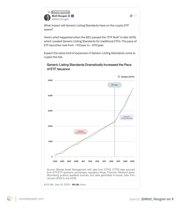 Os padrões de listagem genéricos aprovados em setembro de 2025 eliminaram a necessidade de aprovações individuais 19(b) para ETPs de cripto que qualificam.