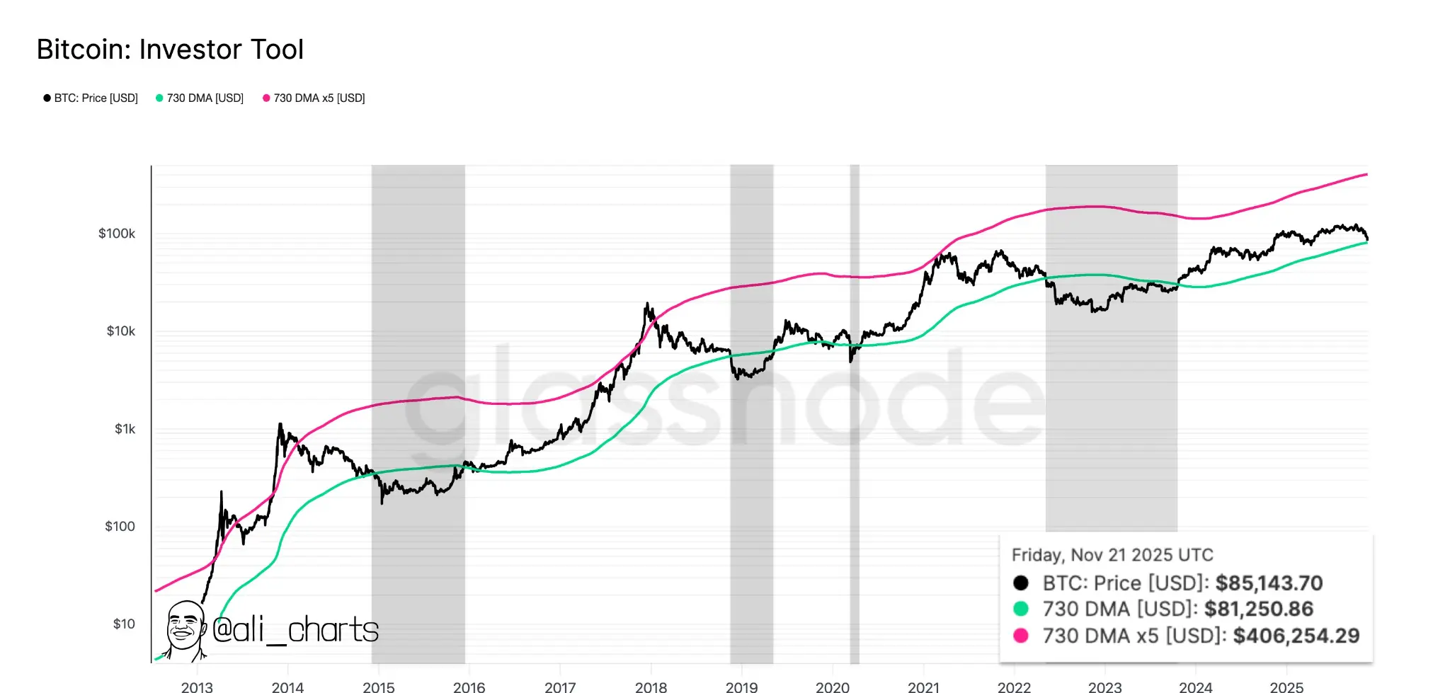 A média móvel simples de 730 dias (SMA), um indicador de tendência de dois anos que historicamente marcou transições para mercados em baixa do Bitcoin, agora está em aproximadamente $81,250, de acordo com as informações compartilhadas pelo analista de criptomoedas Ali Martinez.