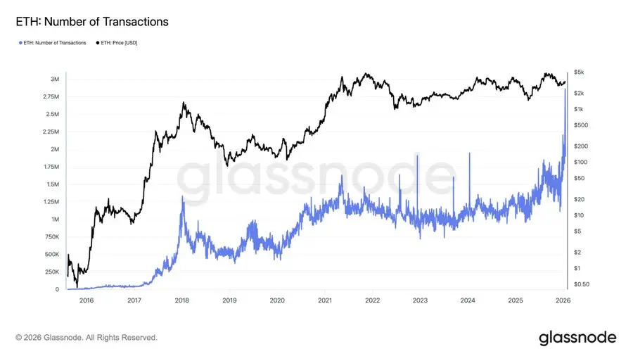 No dia 7 de fevereiro, o volume de transações atingiu um máximo histórico de 2,896 milhões, e em 22 de fevereiro manteve-se acima de 1,7 milhões. No início de 2026, houve uma recuperação significativa em relação ao mesmo período de 2025, impulsionada principalmente por stablecoins e atividades em L2.