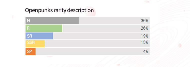 OpenPunks is composed of multiple basic elements, each element has a different classification attribute and a specific degree of rarity. According to the degree of rarity, the order is: SP>SSR>SR>R>N