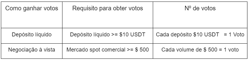 - Cada valor de depósito líquido de $10 USDT = 1 Voto; Cada volume de negociação à vista de $500 = 1 Voto.