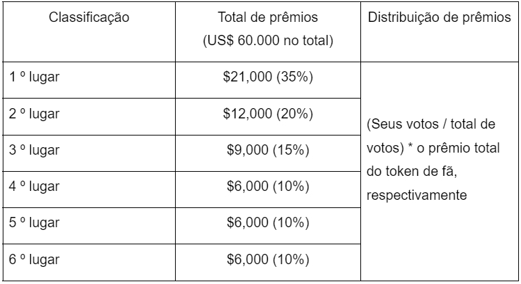 - Recompensa = (Votos do Participante / Votos Totais) O prêmio total do Token de Fã
